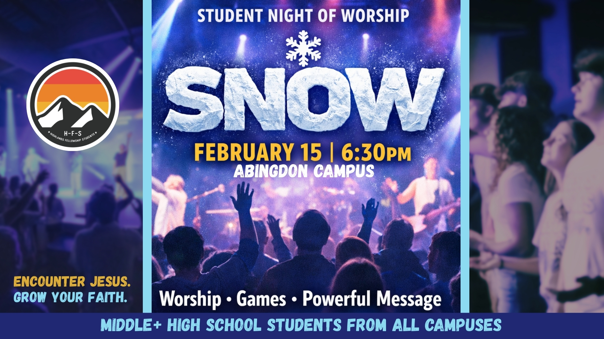 Join us Middle School + High School Students at the Abingdon Campus in the Auditorium for a Student Night of Worship! We will have a fun night of worship, games, refreshments, and a great message!