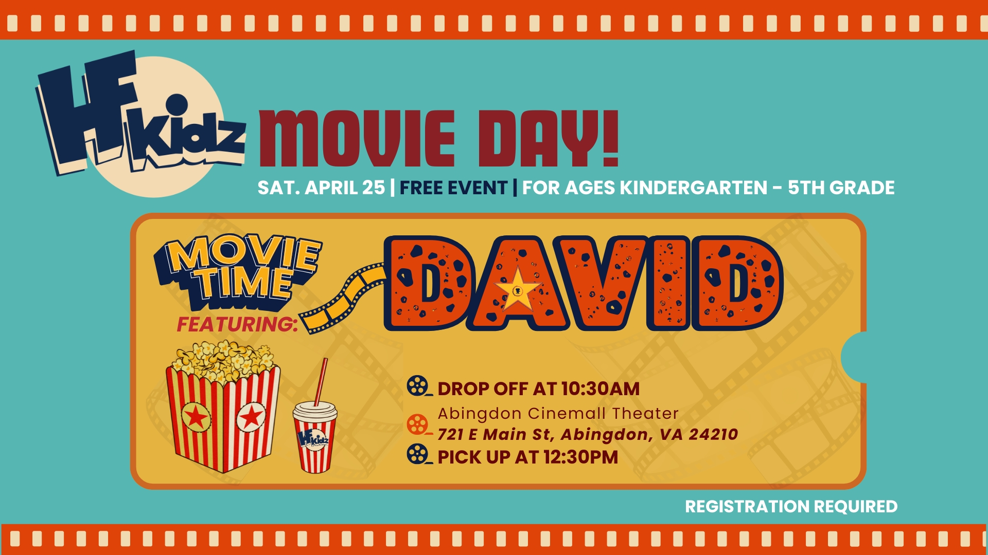 Join us for a fun-filled morning at the movies! HKidz (Kindergarten–5th Grade) are heading to the movies to see the movie "David" on April 25th! This free event is a great opportunity for kids to enjoy a movie with friends in a safe and supervised environment. Drop off will be at 10:30am at Abingdon Cinemall Movie Theater (721 E Main St, Abingdon, VA 24210). Parent pick-up will be at 12:30pm at theater. Each child will receive a kids snack pack, including popcorn, candy, + a drink! Registration is required due to limited capacity, so be sure to register early! We can’t wait for a great day at the movies together!